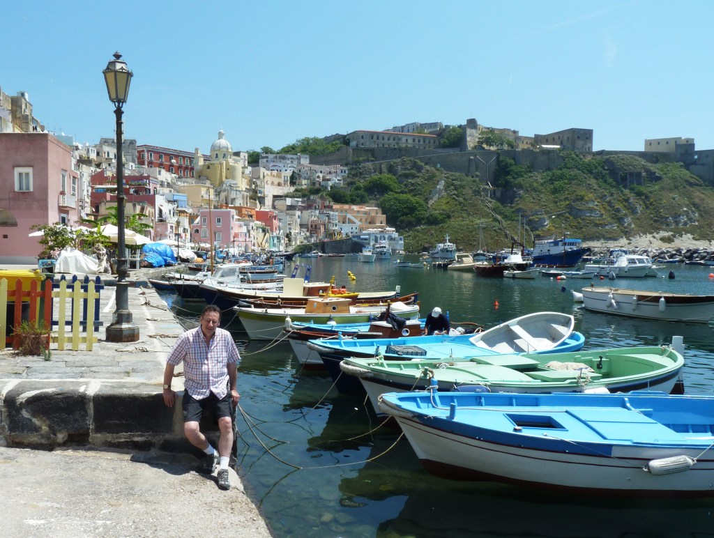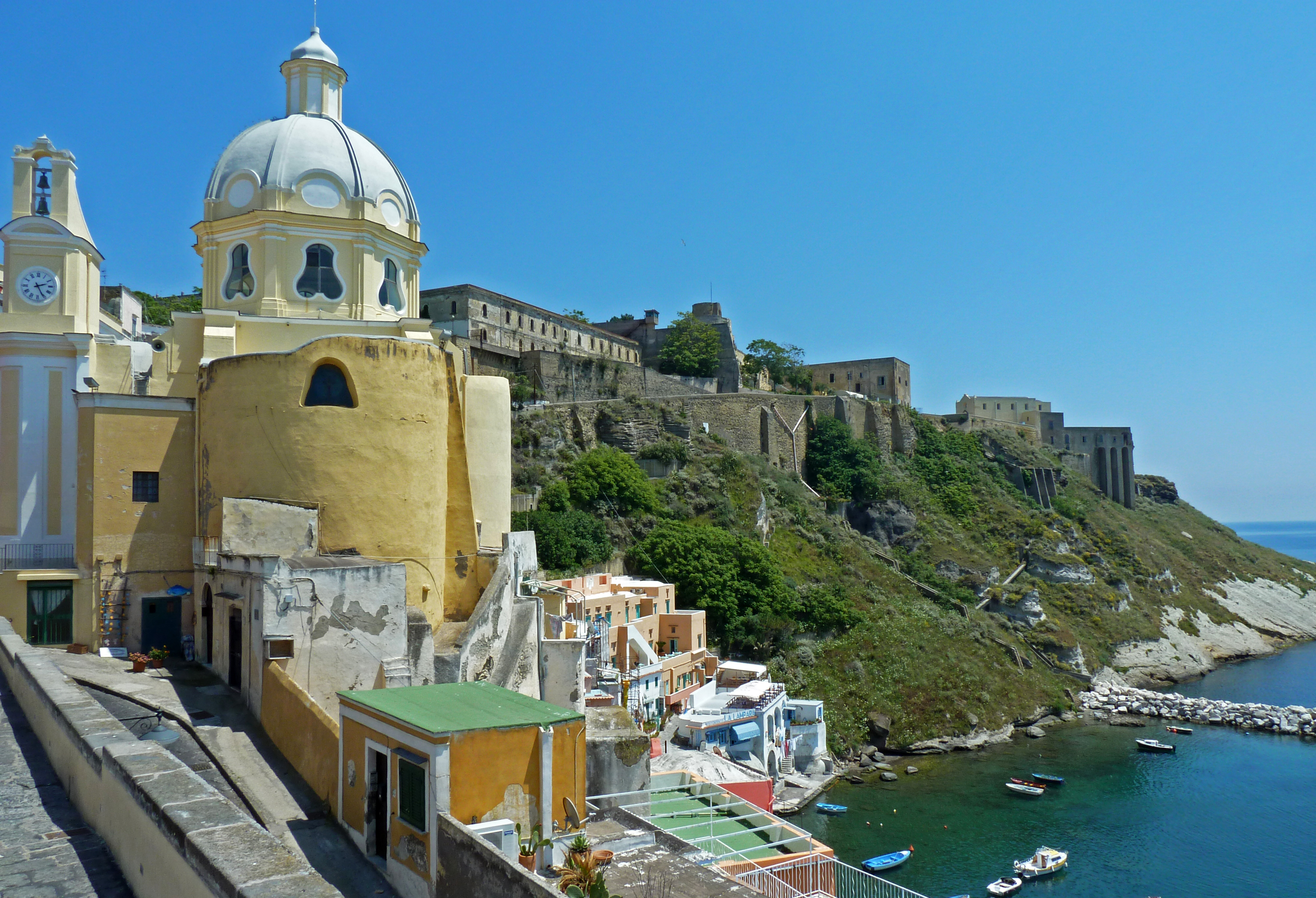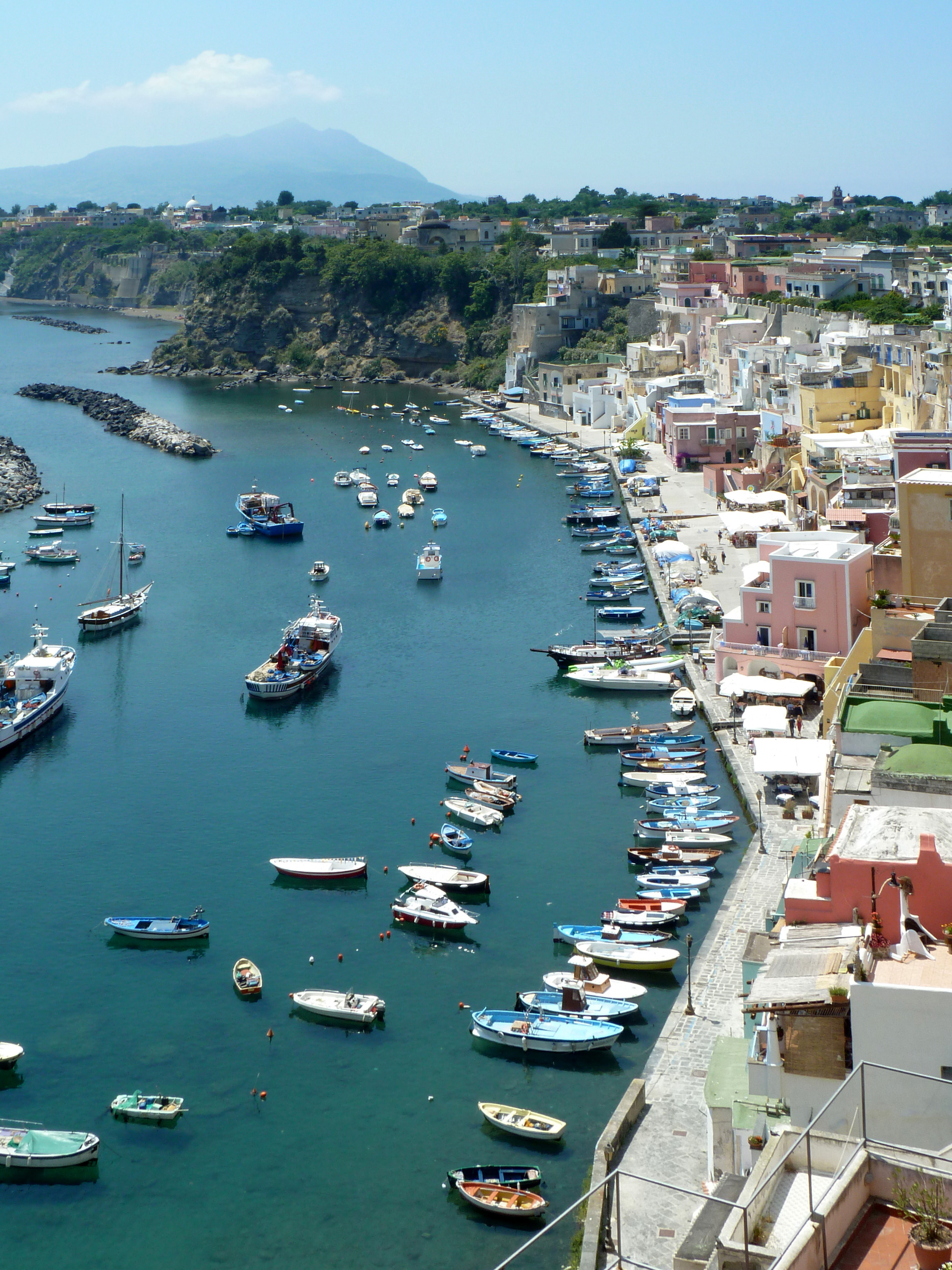 From Ischia, a ferry can take you to the small island of Procida. It docks at Corricella at the western and most rugged end of the island, but it is on the far side of the steep ridge to which the town clings that you find the sun trap of Corricella’s marina. It is overlooked by a dilapidated post-medieval fort from which there are views west back across the wide arc of the busy bay and back to Ischia.